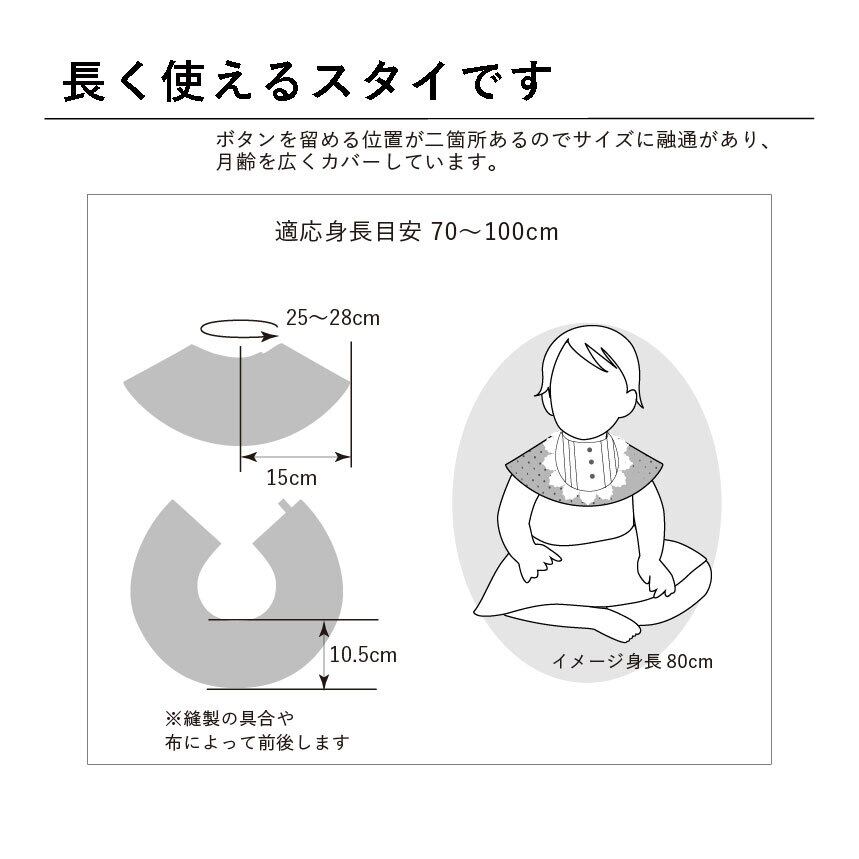 スタイが必要な時期には個人差がありますが、tartiのスタイはボタンを留める位置が二箇所あるので、月齢を広くカバーしたサイズ対応となっており、長くご使用いただけます。