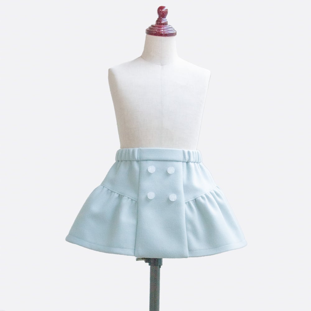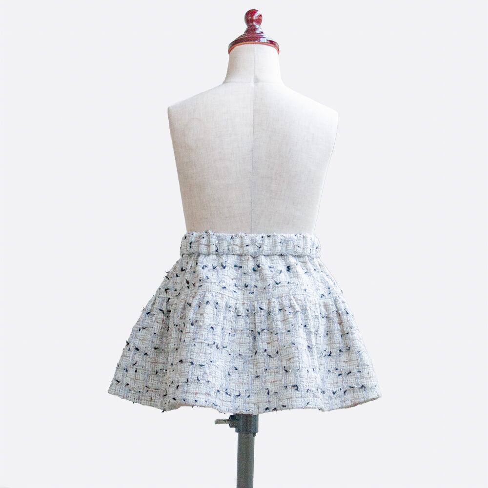 ガーリーなティアードスカートに、前ボタンでトラッドな雰囲気を加えたスカートの型紙です。ウエストは脱ぎ着がしやすいゴム仕様です。
