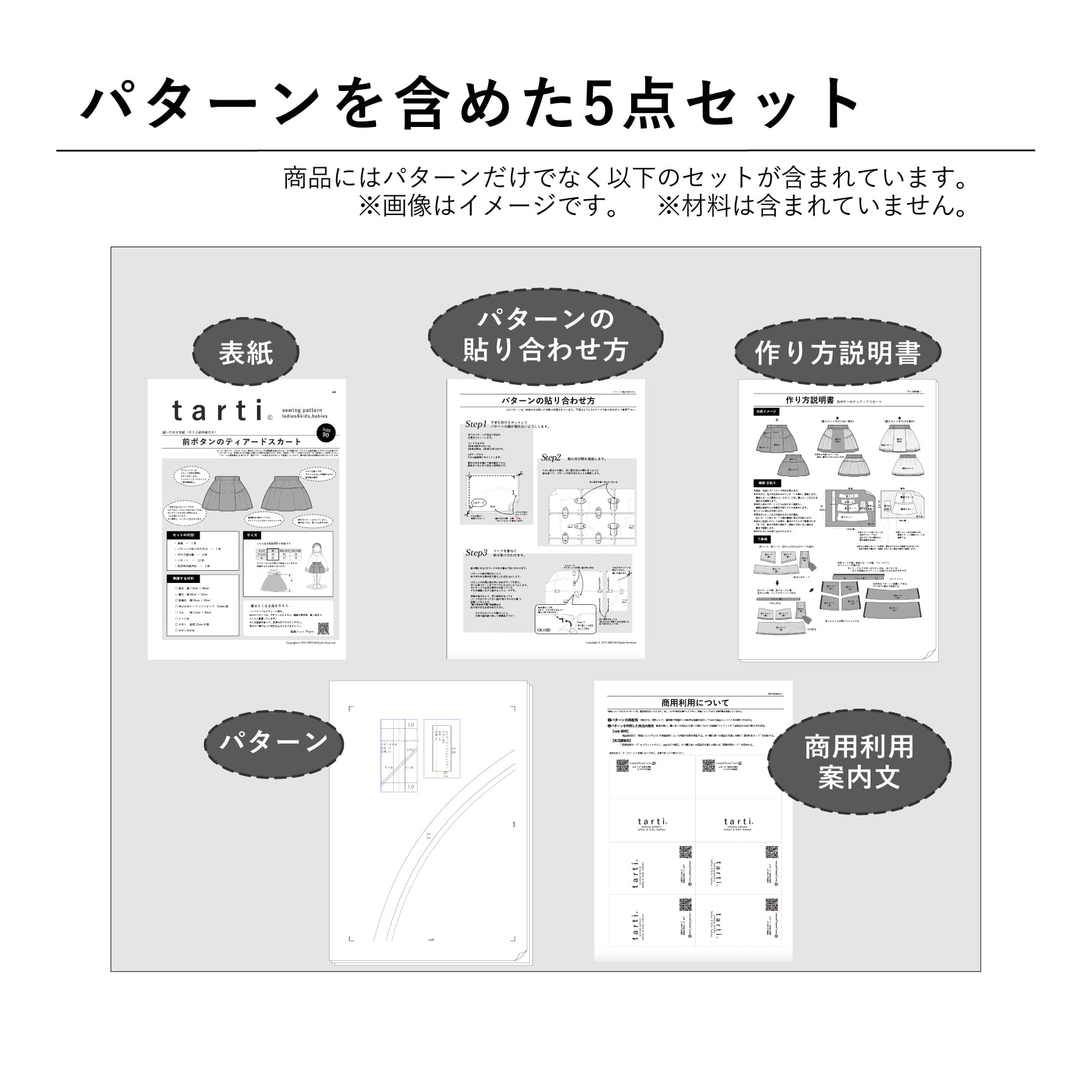 ❷パターンを利用した商品の販売 販売の際と、購入者への商品引き渡しの際にtarti の型紙だということを下記指定の方法で表示すれば可。