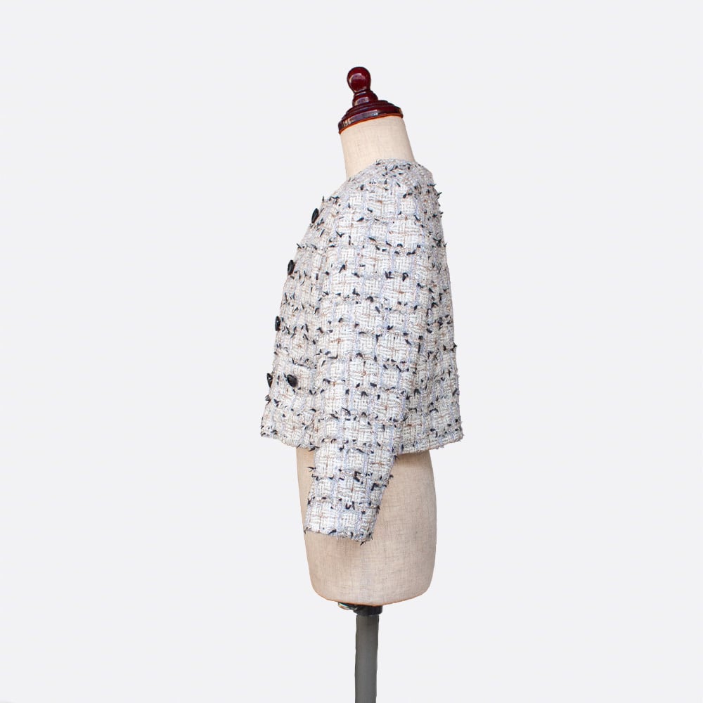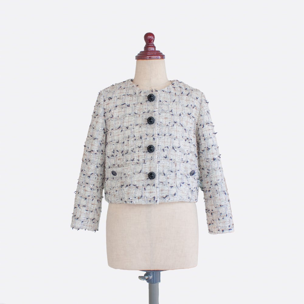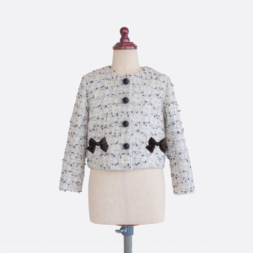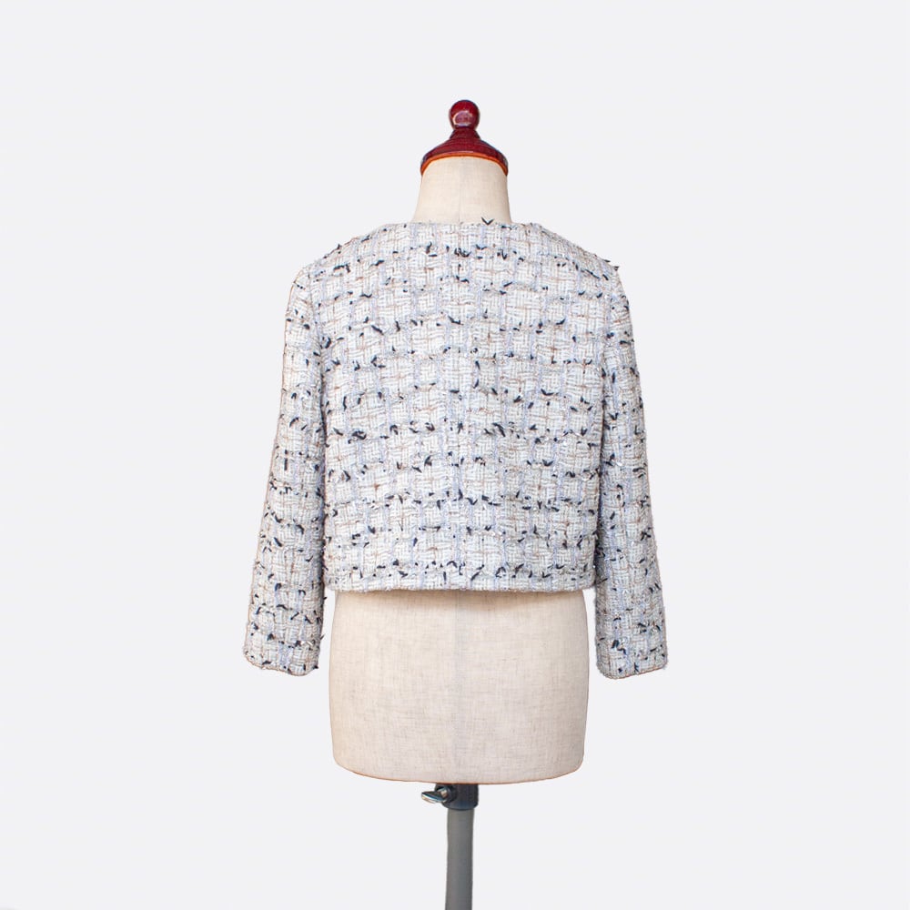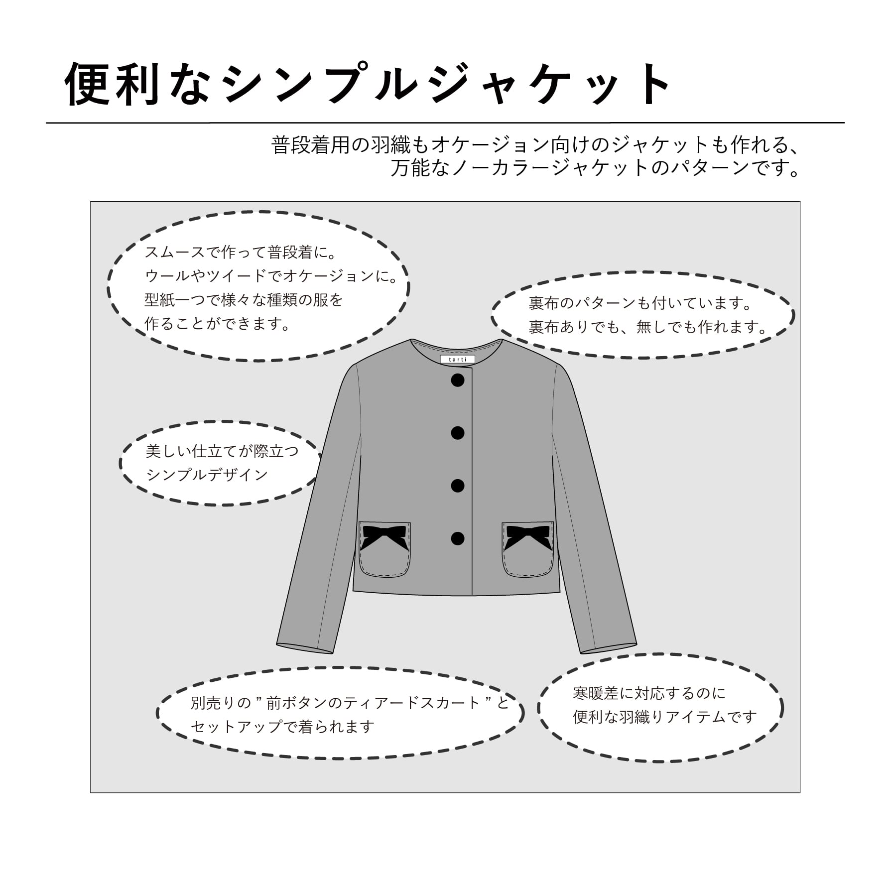 普段着用の羽織りもオケージョン向けのジャケットも作れる、万能なノーカラージャケットのパターンです。
