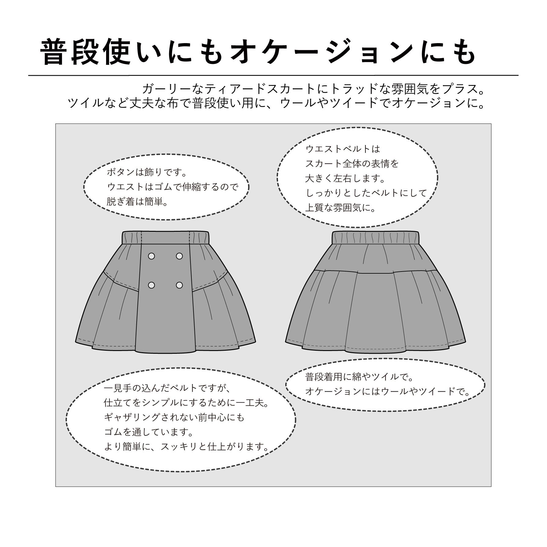 ガーリーなティアードスカートに、前ボタンでトラッドな雰囲気を加えたスカートの型紙です。ウエストは脱ぎ着がしやすいゴム仕様です。